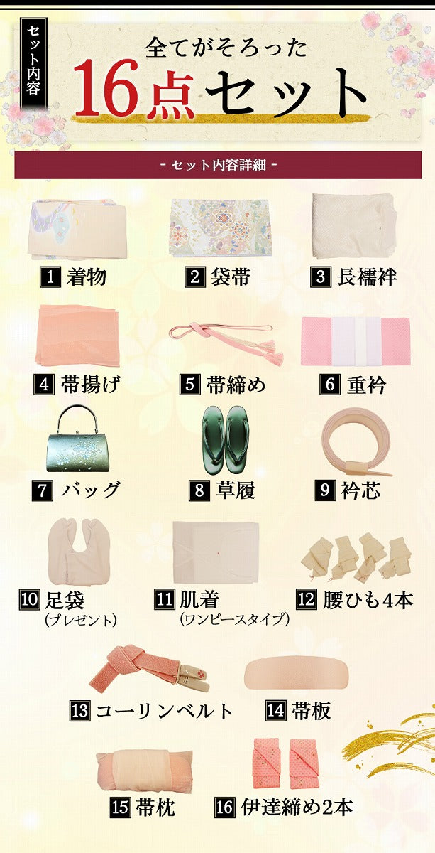 セット内容 着物・袋帯・長襦袢(半衿付)・帯揚・帯締・重衿・草履・バック・衿しん・足袋・肌着(ワンピース)・腰ひも4本・和装ベルト1本・帯板1本・帯枕・伊達締め2本