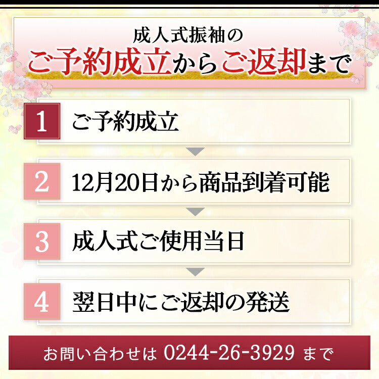 | 配送について | レンタル期間はご利用時の3日前からレンタル可能です(成人式は7日前から予約可能)。 ご使用後は返却チェックシートをご利用いただいた後、同封しております着払シートをご利用いただいてゆうパックでご発送ください。 |
