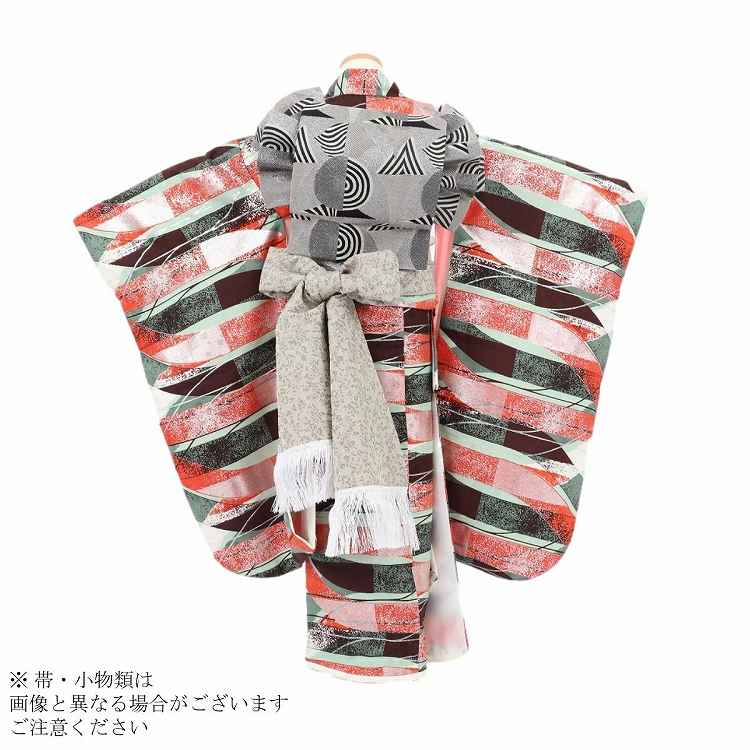 七五三 着物 レンタル 7歳 女の子 【モダンアンテナ オレンジ緑横縞】 7歳 七五三 着物 レトロ 【レンタル】 アンティーク 七五三 着物 7歳 フルセット レンタル 七五三 7歳 帯 作り帯 袋帯 に変更可能 七五三 着物 7歳 女の子 小さめ