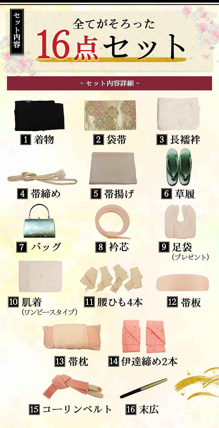 セット内容 留袖・袋帯・長襦袢(半衿付)・帯揚・帯締・末広(金銀)・草履・バック・衿しん・足袋・肌着(ワンピース)・腰ひも4本・和装ベルト1本・帯板1本・帯枕・伊達締め2本