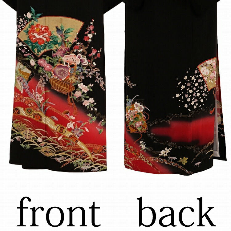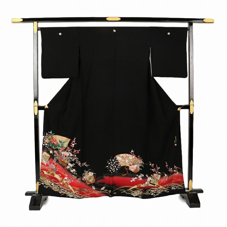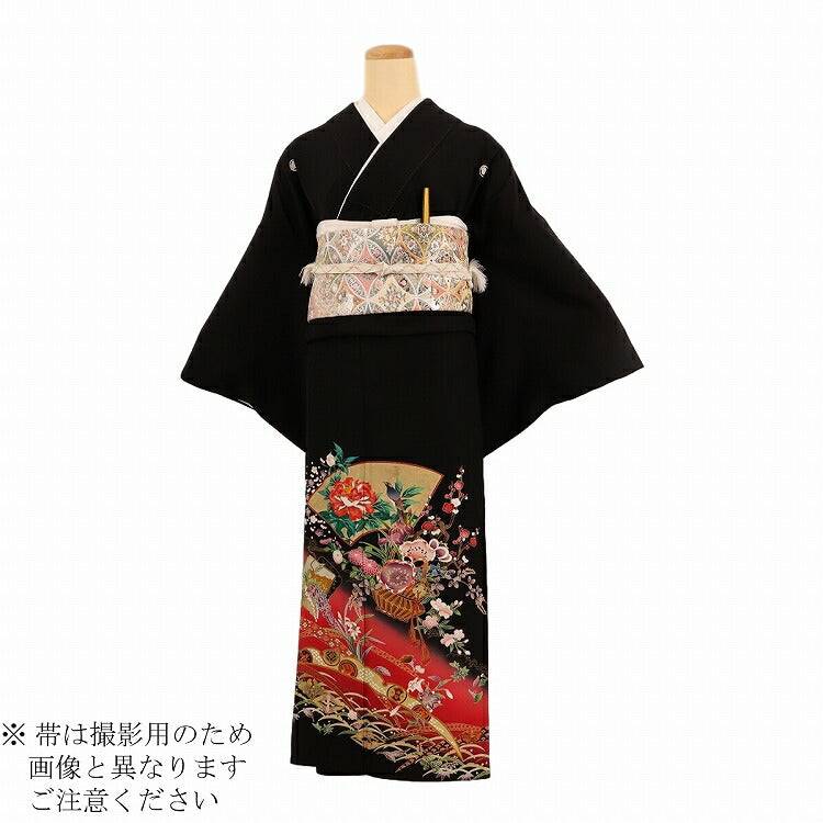 結婚式 黒留袖 レンタル 夏用 単衣 おすすめ Mサイズ ワイン露芝花篭扇 正絹 留袖 レンタル 留袖レンタル 黒留袖レンタル 【レンタル】 結婚式 単衣 母親 20代 30代 40代 50代 60代