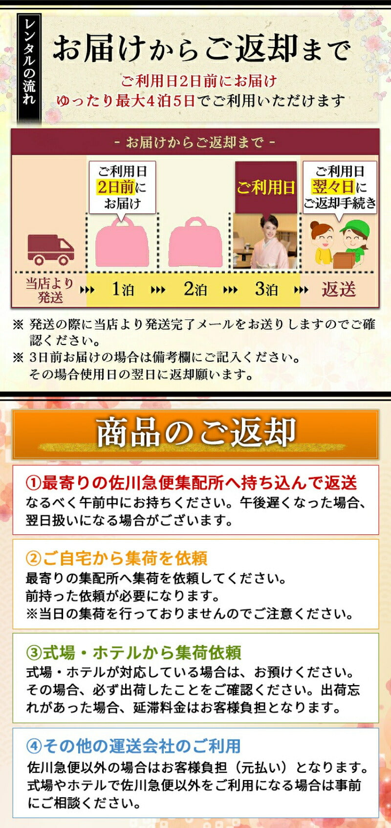 | 備考 | ※その他着付けに必要となるものがある可能性がございます。着付けされる方にお聞きいただきご準備ください。(着付け時に使用する補正用のタオルなど) ※髪飾りは美容師さんとご相談くださいませ。 |