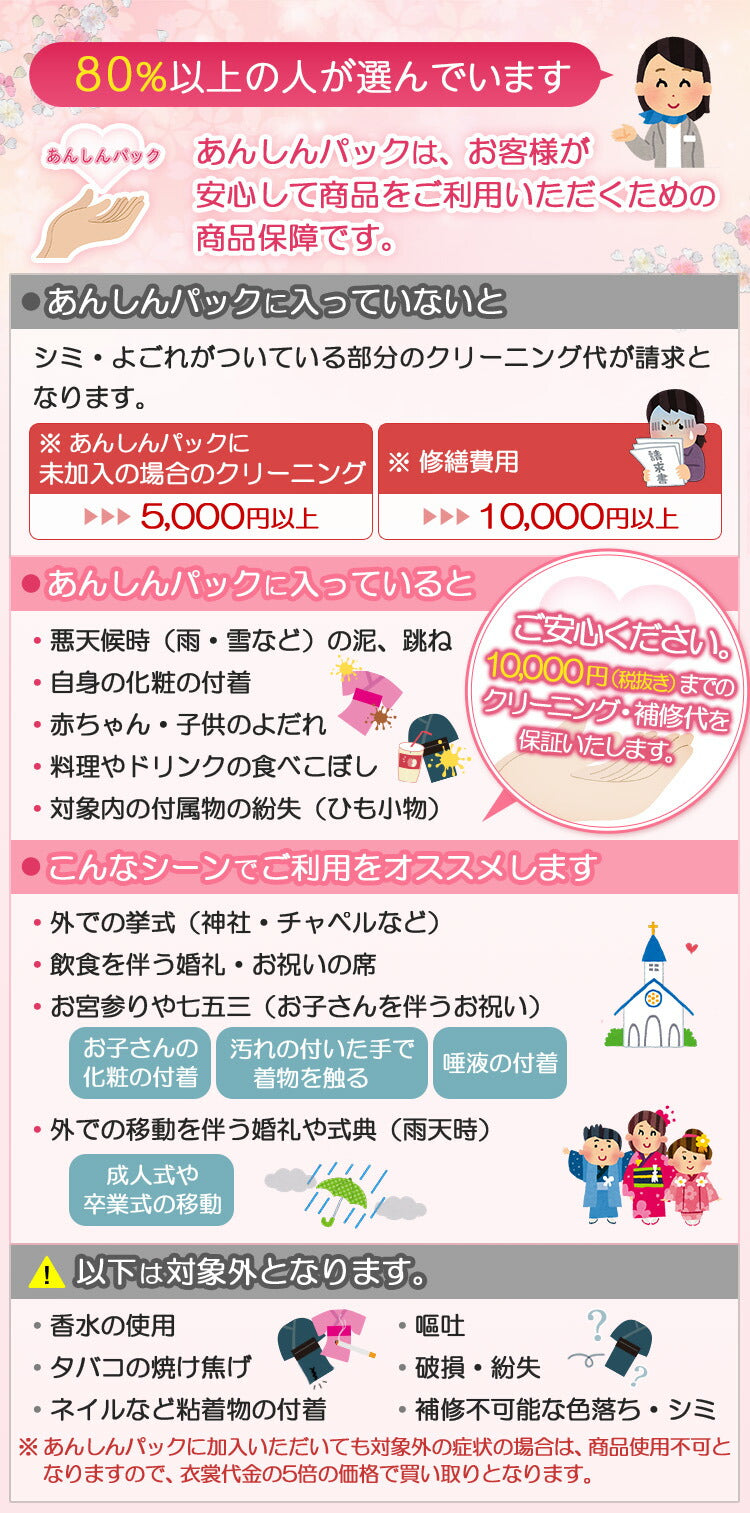 当店ではお客様に安心して商品ご着用いただくため、レンタル時に1,100円(税込)加入できる「あんしんパック」サービスをご用意しております。