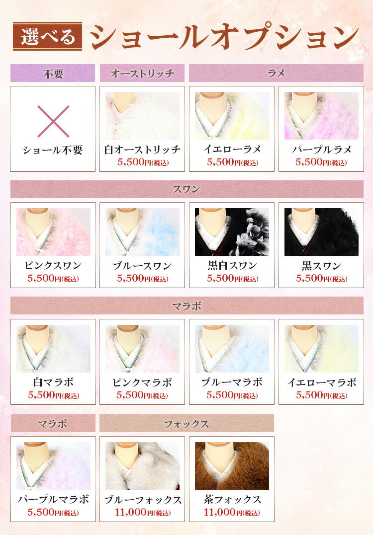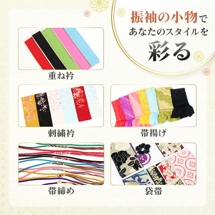 | セット内容 | 振袖・袋帯・長襦袢・帯揚・帯〆・重衿・草履・バック・衿しん・足袋・肌着(ワンピース)・ひも5本・和装ベルト2本・帯板2本・伊達締め2本・帯枕・三重仮ひも ※足袋はプレゼントいたします。 ※ショールご希望の方は無料でお付けいたします。 |