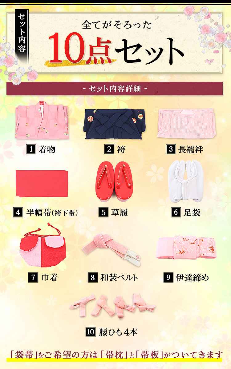 | セット内容 | 着物・袴・長襦袢・半幅帯(袴下帯)・草履・足袋・巾着・和装ベルト・髪飾り・伊達締め1本・腰ひも4本 ※新品足袋プレゼント! ※箱タイプでの発送になります。 |