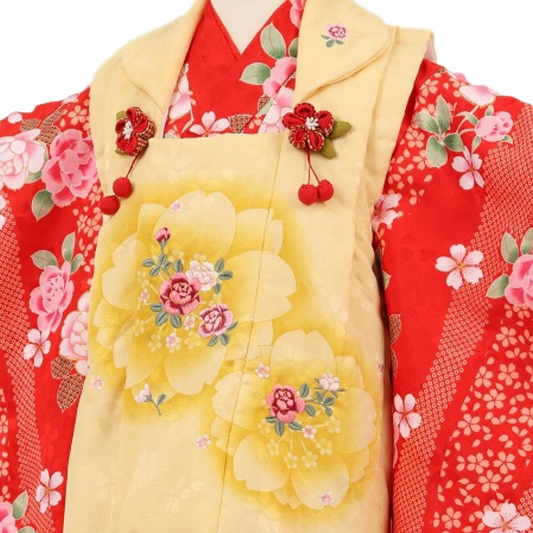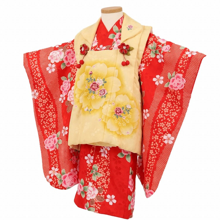 | セット内容 | 着物・被布コート・長襦袢・草履・足袋・巾着(バック)・髪飾り・腰ひも2本 ※新品足袋プレゼント! ※腰ひもは着物にも縫いつけてあります。 ※箱タイプでの発送になります。 |