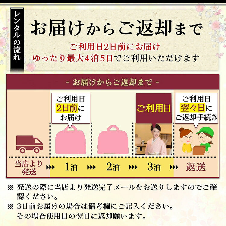 | 備考 | ※その他着付けに必要となるものがある可能性がございます。着付けされる方にお聞きいただきご準備ください。(着付け時に使用する補正用のタオルなど) |