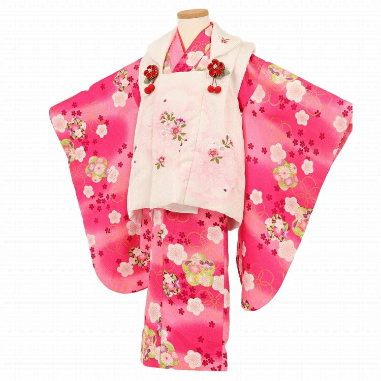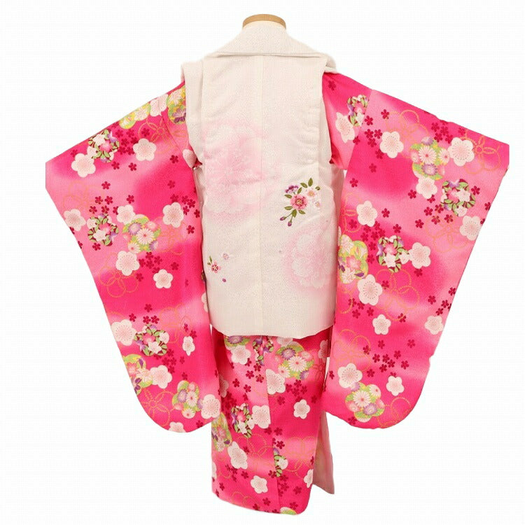 | セット内容 | 着物・被布コート・長襦袢・草履・足袋・巾着(バック)・髪飾り・腰ひも2本 ※新品足袋プレゼント! ※腰ひもは着物にも縫いつけてあります。 ※箱タイプでの発送になります。 |