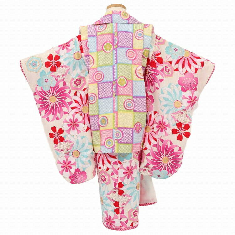 | セット内容 | 着物・被布コート・長襦袢・草履・足袋・巾着(バック)・髪飾り・腰ひも2本 ※新品足袋プレゼント! ※腰ひもは着物にも縫いつけてあります。 ※箱タイプでの発送になります。 |
