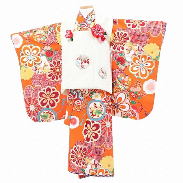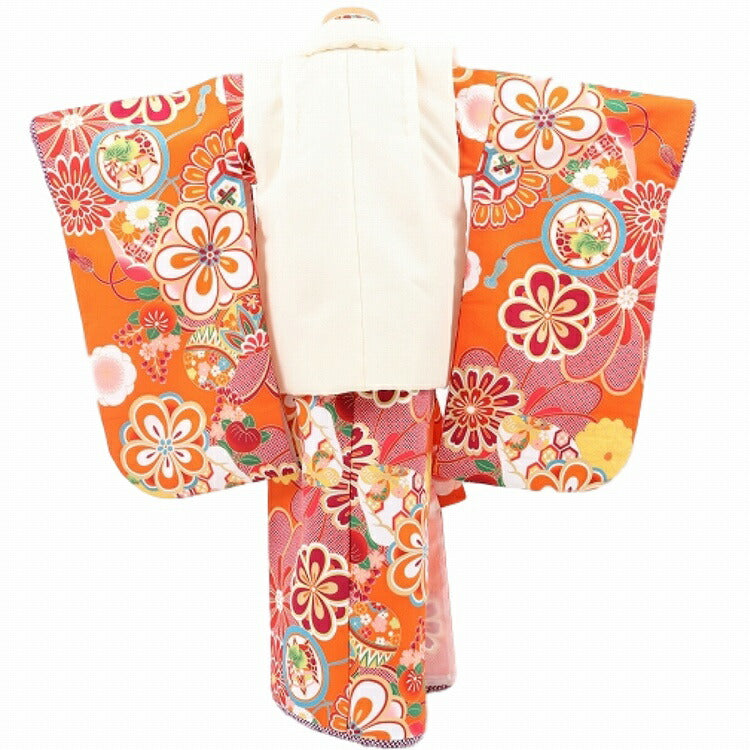 | セット内容 | 着物・被布コート・長襦袢・草履・足袋・巾着(バック)・髪飾り・腰ひも2本 ※新品足袋プレゼント! ※腰ひもは着物にも縫いつけてあります。 ※箱タイプでの発送になります。 |