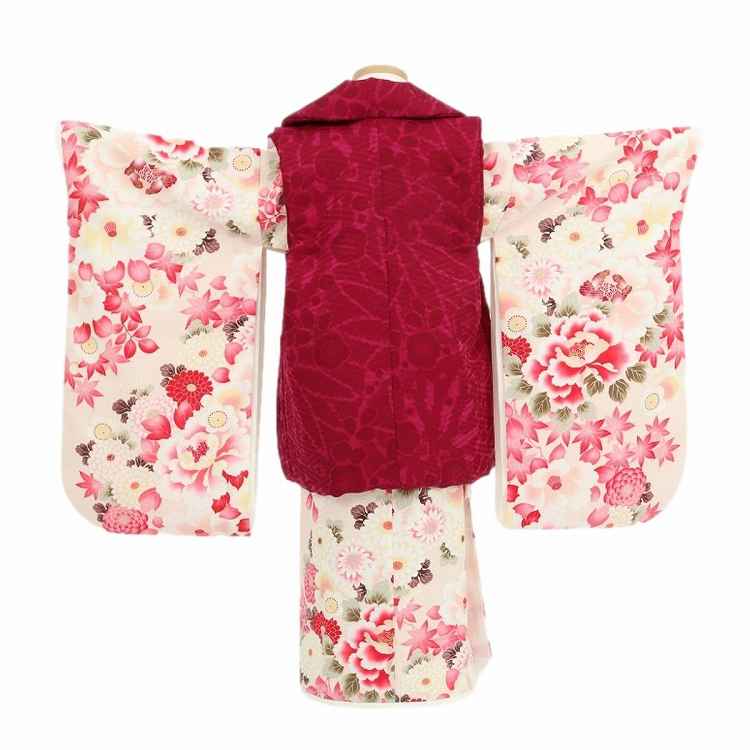 | セット内容 | 着物・被布コート・長襦袢・草履・足袋・巾着(バック)・髪飾り・腰ひも2本 ※新品足袋プレゼント! ※腰ひもは着物にも縫いつけてあります。 ※箱タイプでの発送になります。 |