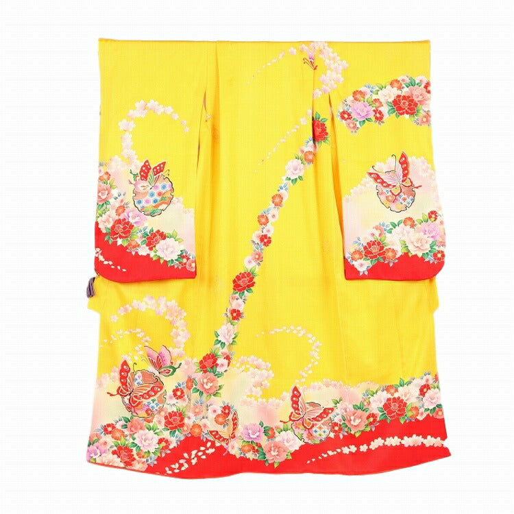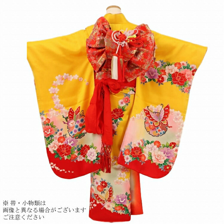 七五三 着物 レンタル 7歳 女の子 【正絹 黄赤花雪輪蝶】 7歳 七五三 着物 レトロ 【レンタル】 アンティーク 七五三 着物 7歳 フルセット レンタル 七五三 7歳 帯 作り帯 袋帯 に変更可能 七五三 着物 7歳 女の子 小さめ