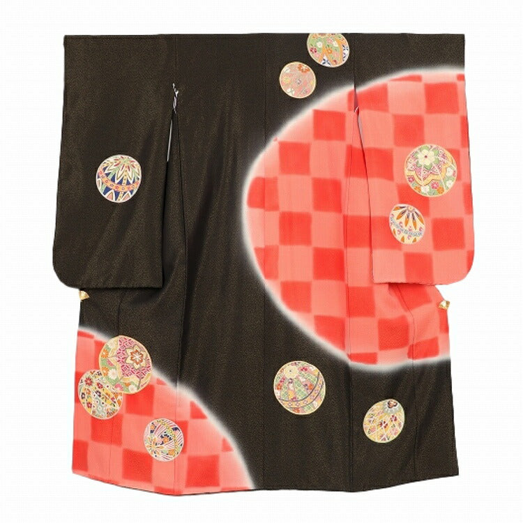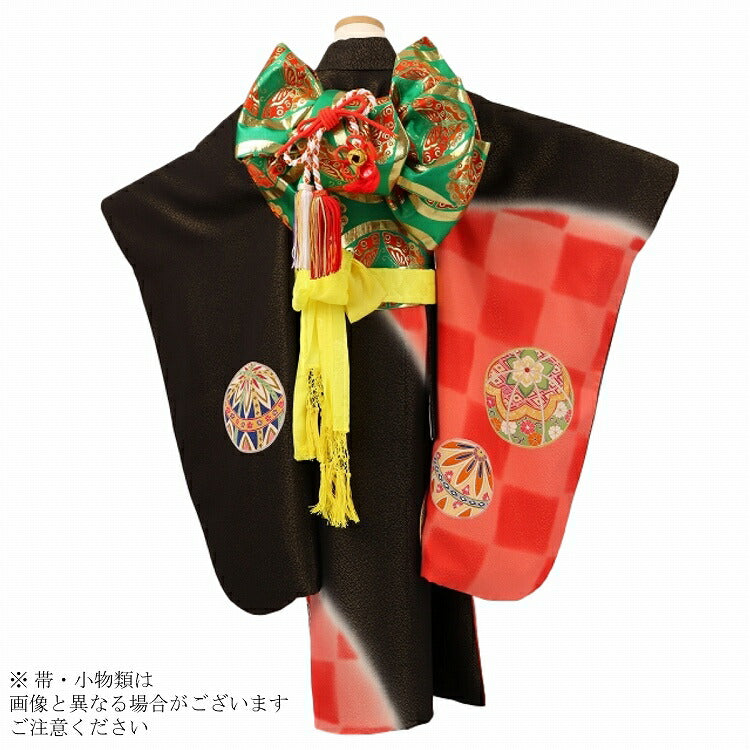 七五三 着物 レンタル 7歳 女の子 【正絹 黒赤鞠尽くし】 7歳 七五三 着物 レトロ 【レンタル】 アンティーク 七五三 着物 7歳 フルセット レンタル 七五三 7歳 帯 作り帯 袋帯 に変更可能 七五三 着物 7歳 女の子 小さめ