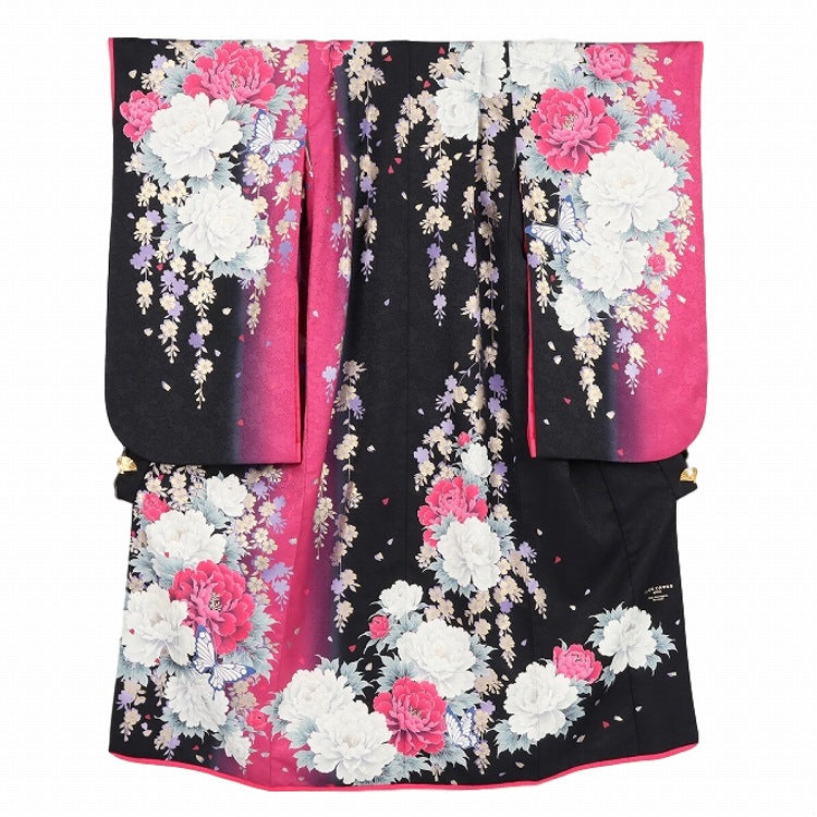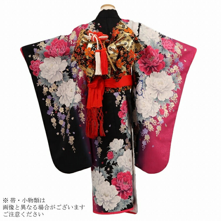 七五三 着物 レンタル 7歳 女の子 【黒ワイン牡丹桜蝶】 7歳 七五三 着物 レトロ 【レンタル】 アンティーク 七五三 着物 7歳 フルセット レンタル 七五三 7歳 帯 作り帯 袋帯 に変更可能 七五三 着物 7歳 女の子 小さめ
