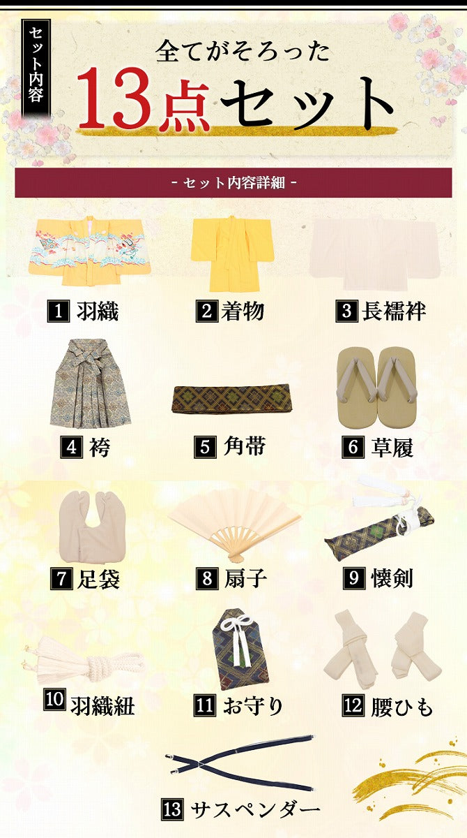 セット内容 羽織・着物・長襦袢・袴・角帯・草履・足袋・扇子・短剣・羽織紐・お守り・腰ひも2本・サスペンダー